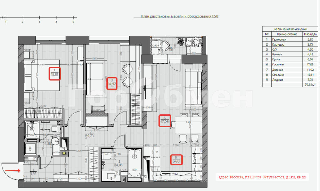 Общая площадь: 79,3м, по комнатам: 15,81м-14,92м, кухня-столовая: 23,65м